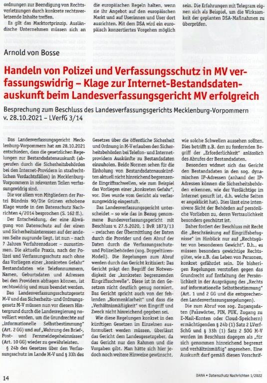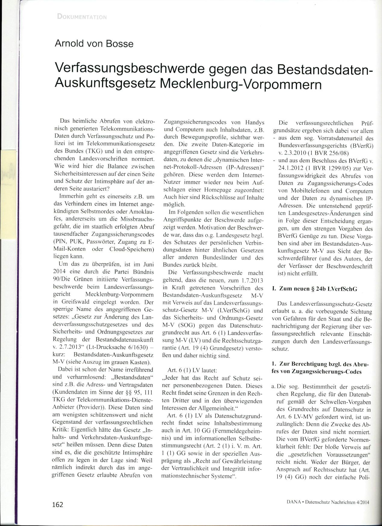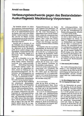 Die Verfassungsbeschwerde macht geltend, dass die neuen zum 1.7.2013 in Kraft getretenen Vorschriften des Bestandsdaten-Auskunftsgesetz M-V (mit Verweis auf: Landesverfassungsschutz-Gesetz M-V (LVerfSchG) und Sicherheits- und Ordnungs-Gesetz M-V (SOG) gegen das Datenschutzgrundrecht aus Art. 6 (1) Landesverfassung M-V (LV) und die Rechtsschutzgarantie (Art. 19 (4) Grundgesetz) verstoßen und daher nichtig sind.
