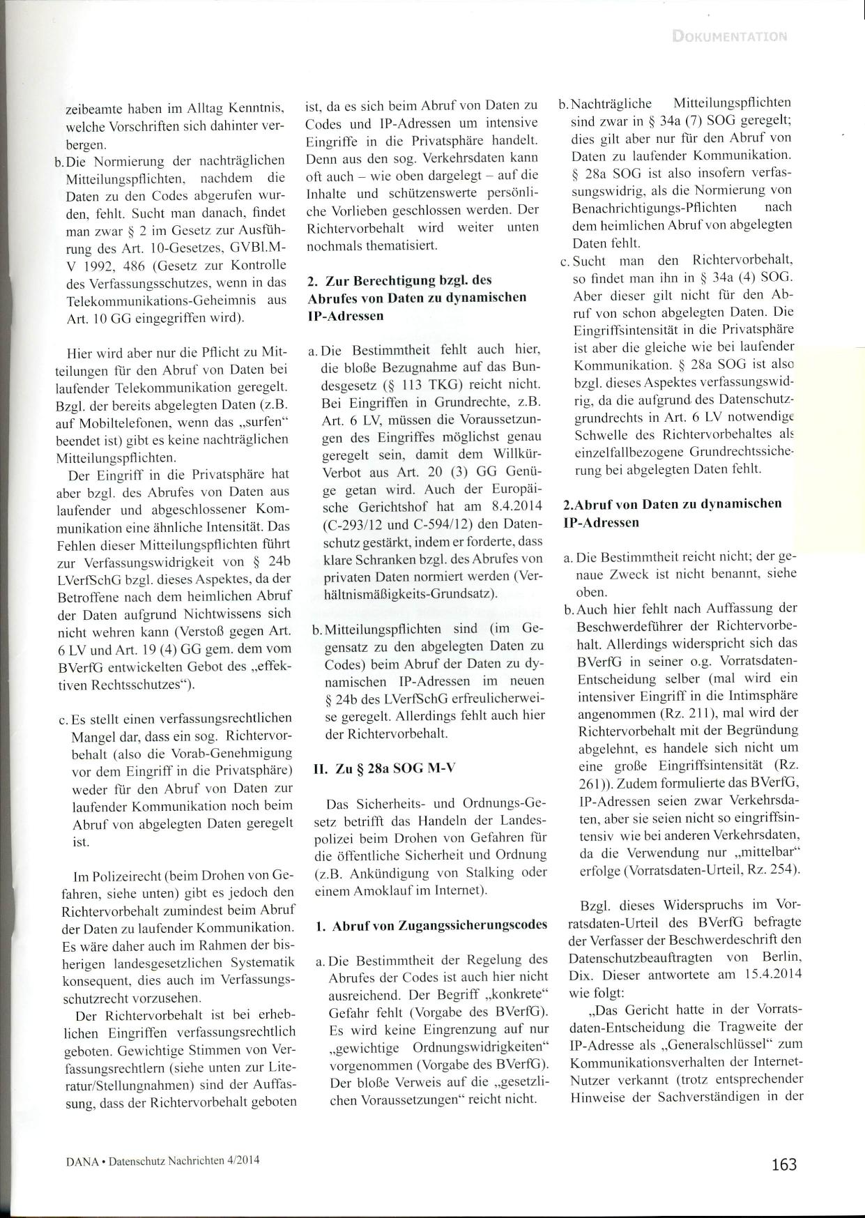 c. Sucht man den Richtervorbehalt, so findet man ihn in § 34a (4) SOG. Aber dieser gilt nicht für den Abruf von schon abgelegten Daten. Die Eingriffsintensität in die Privatsphäre ist aber die gleiche wie bei laufender Kommunikation. § 28a SOG ist also bzgl. dieses Aspektes verfassungswidrig, da die aufgrund des Datengrundrechts in Art. 6 LV notwendige Schwelle des Richtervorbehaltes als einzelfallbezogene Grundrechtssicherung bei abgelegten Daten fehlt.