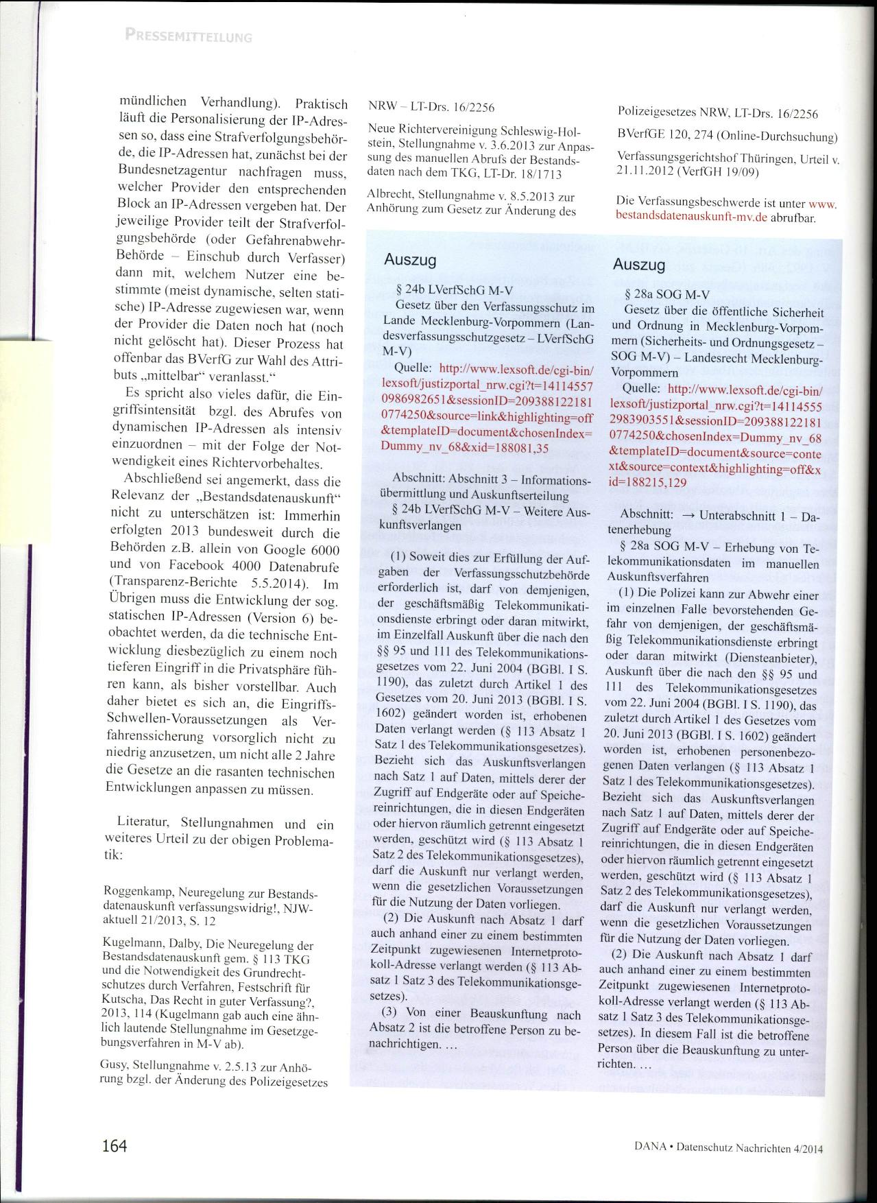 - Kugelmann, Dalby, Die Neuregelung der Bestandsdatenauskunft gem. § 113 TKG und die Notwendigkeit des Grundrechtschutzes durch Verfahren, Festschrift für Kutscha, Das Recht in guter Verfassung?, 2013, 114 (Kugelmann gab auch eine ähnlich lautende Stellungnahme im Gesetzgebungsverfahren in M-V ab).